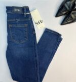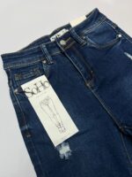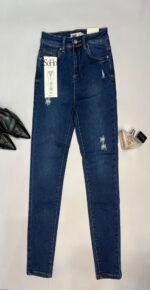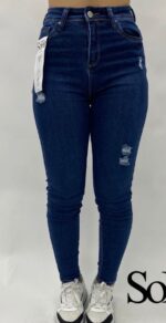 Descripción: Jean de tiro alto. Medio rasgado. Cinco bolsillos. Cierre frontal con cremallera y botón.